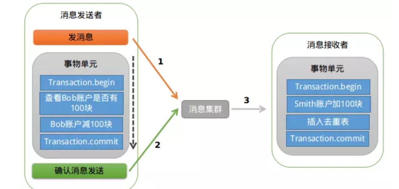 也就是说在业务方法内要想消息队列提交两次请求,一次发送消息和一次确认消息。如果确认消息发送失败了RocketMQ会定期扫描消息集群中的事务消息,这时候发现了Prepared消息,它会向消息发送者确认,所以生产方需要实现一个check接口,RocketMQ会根据发送端设置的策略来决定是回滚还是继续发送确认消息。这样就保证了消息发送与本地事务同时成功或同时失败。